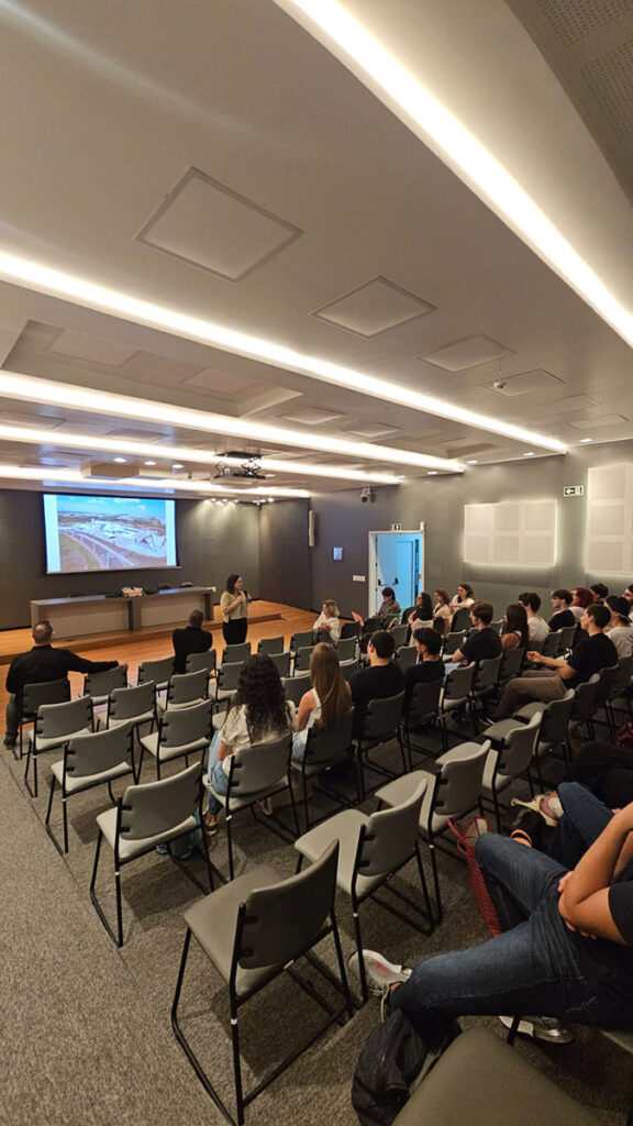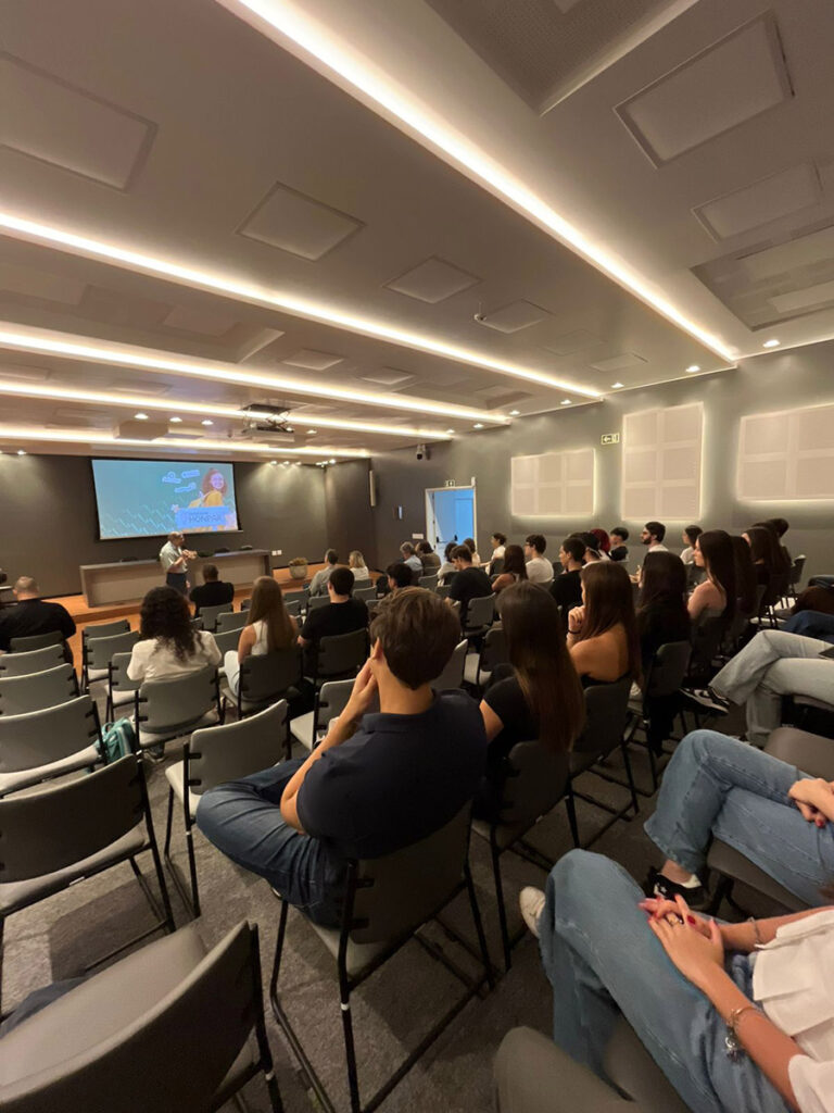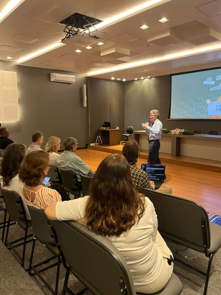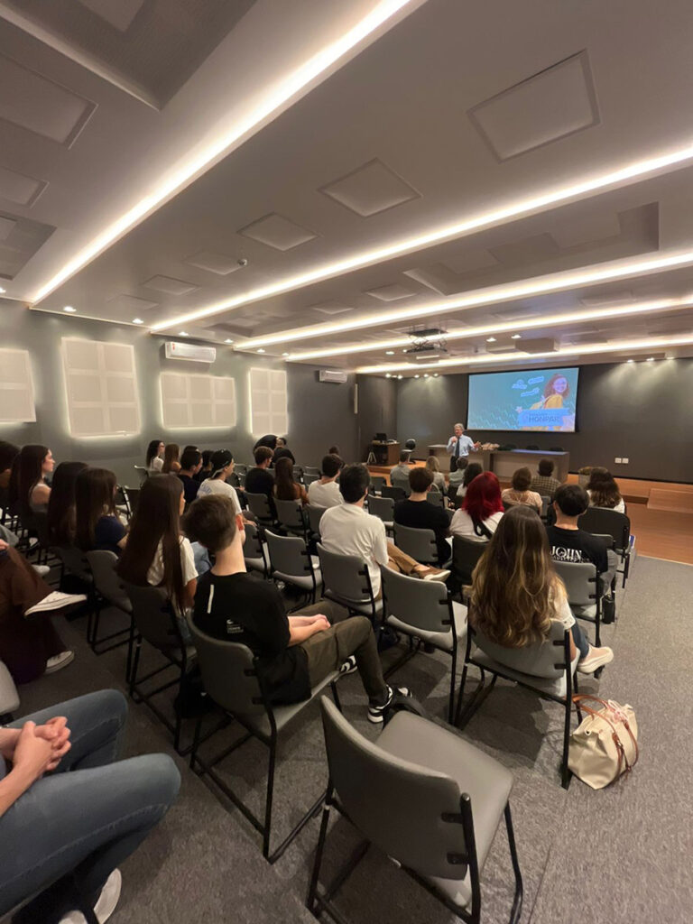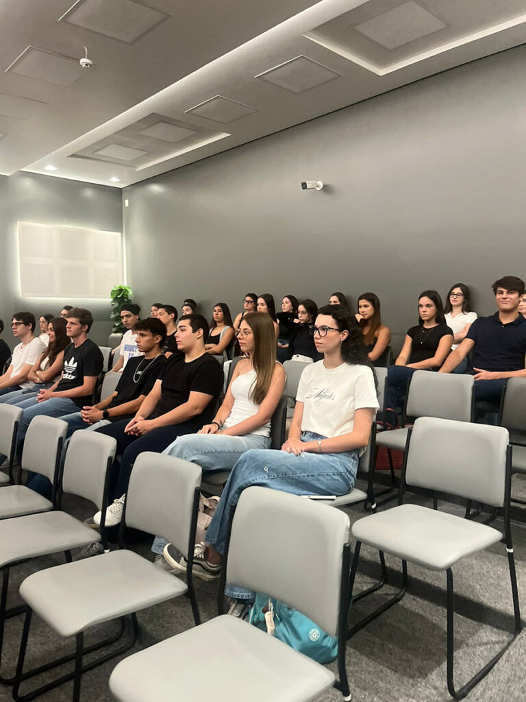 A Prof.ª Camila Perugini Stadtlober, coordenadora do curso de Medicina, detalhou a proposta pedagógica da instituição, destacando o rigor acadêmico e a infraestrutura de ponta oferecida aos alunos.